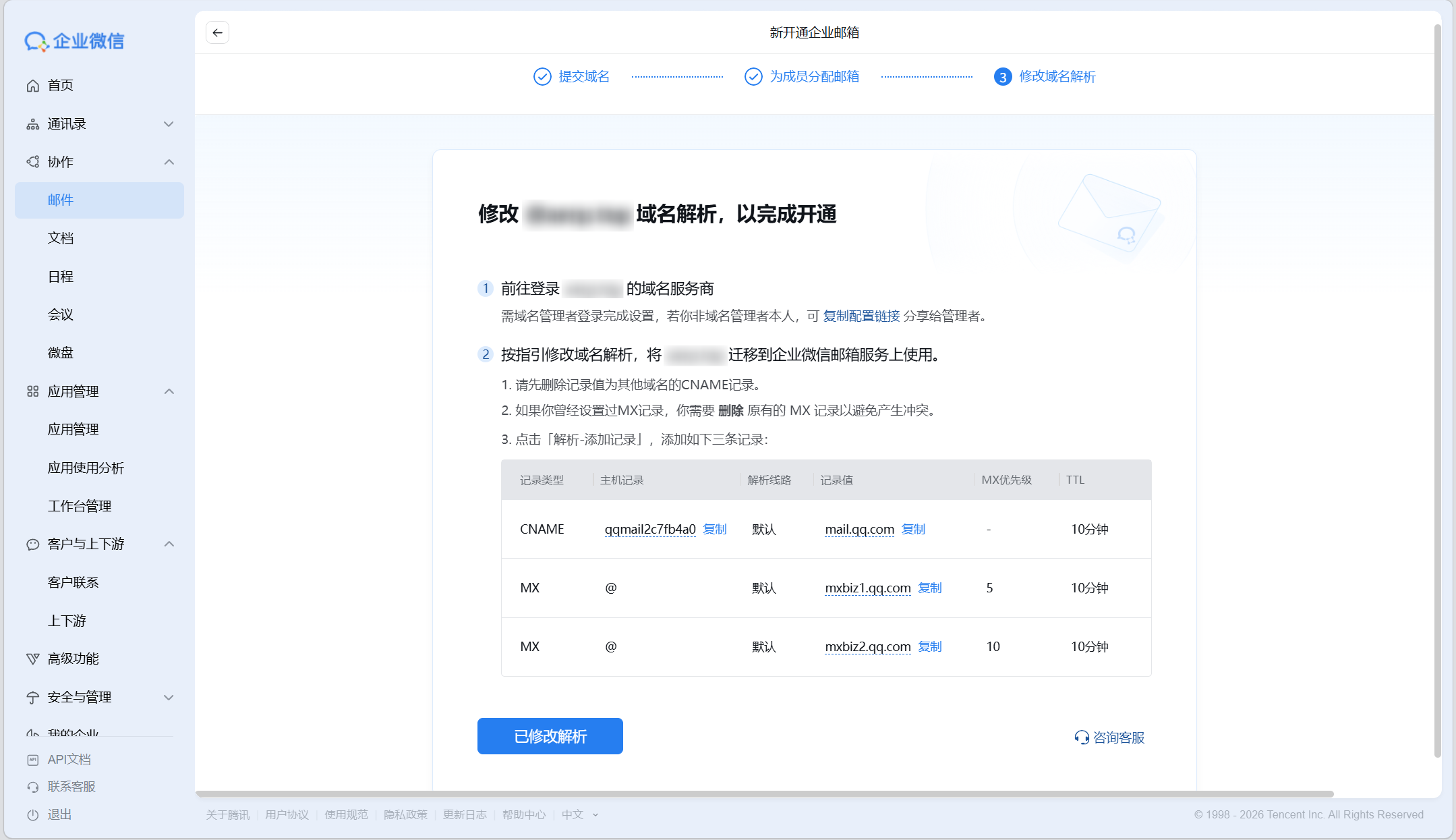 参考文章:自建邮局太麻烦?两种免费域名邮箱方案任你选! - 《二叉树树》官方网站 0.拥有域名 1.企业微信注册企业 https://work.weixin.qq.com/ 2.企业微信使用企业管理员账号登录,主页面-协作-邮件 - 新开通企业邮箱 3.前往域名服务商修改域名解析(参照上图所示)