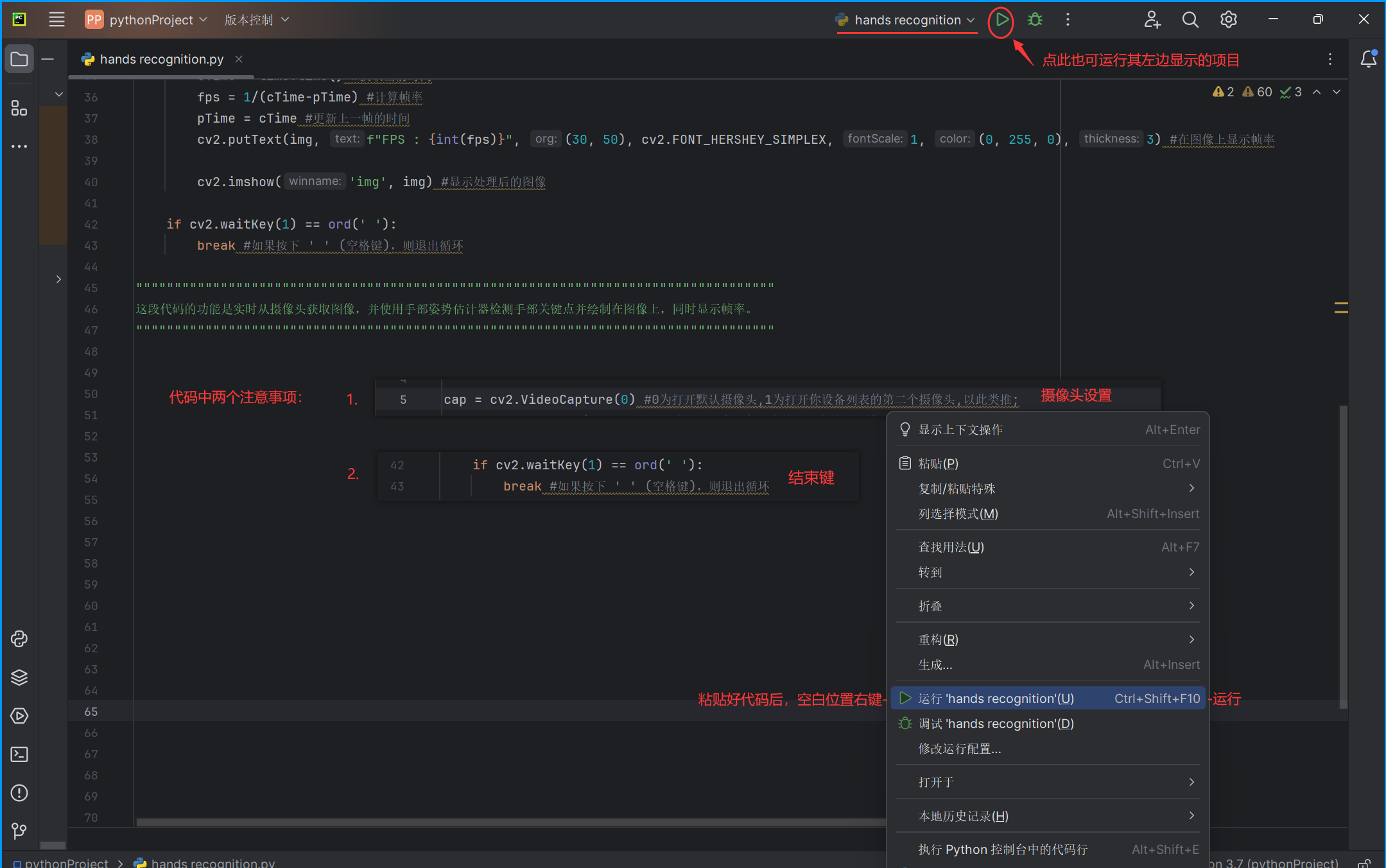 - 学会给代码配置合适的环境并成功运行代码(手部识别)